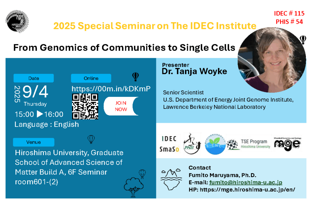[Speaker] Dr.Tanja Woyke, Senior Scientist, U.S. Department of Energy Joint Genome Institute, Lawrence Berkeley National Laboratory [Date/Time] September 4th, 2025 Thursday 15:00-16:00 [Venue] Hiroshima University, Graduate School of Adv... -