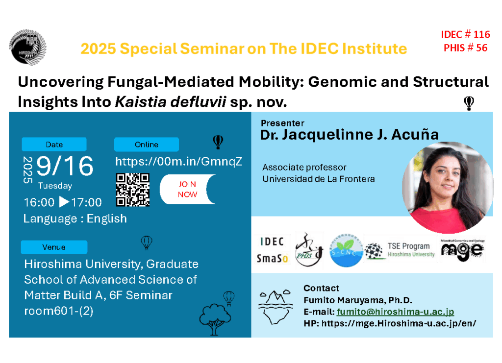 [Speaker] Dr. Jacquelinne J. Acuña, Associate professor, Universidad de La Frontera [Date/Time] September 16th, 2025 Tuesday 16:00-17:00 [Venue] Hiroshima University, Graduate School of Advanced Science of Matter Build A, 6F Seminar room... -