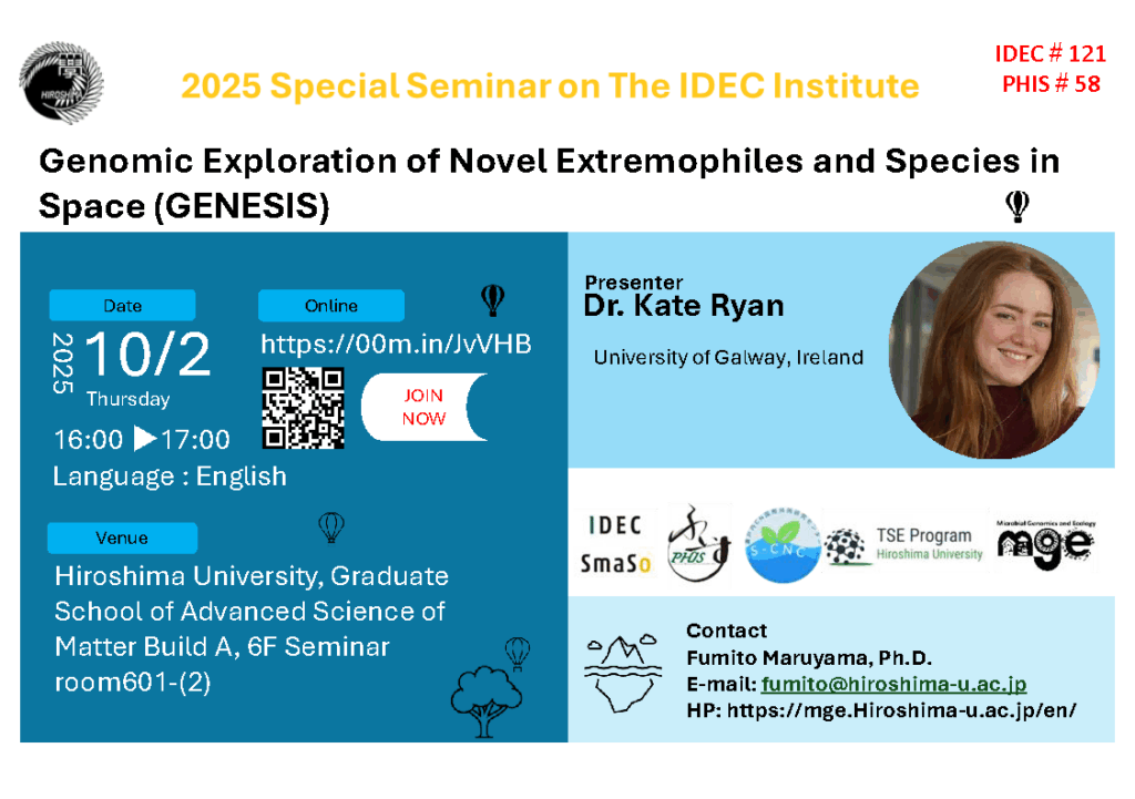 【IDEC Seminar No.121/PHIS Seminar No.58】Genomic Exploration of Novel Extremophiles and Species in Space (GENESIS)