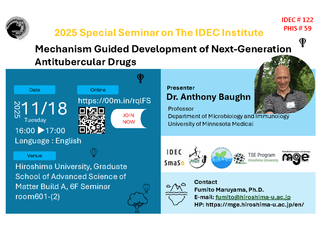 [Speaker] Dr.Anthony Baughn, Professor, Department of Microbiology and Immunology, University of Minnesota Medical [Date/Time] November 18th, 2025 Tuesday 16:00-17:00 [Venue] Hiroshima University, Graduate School of Advanced Science... -