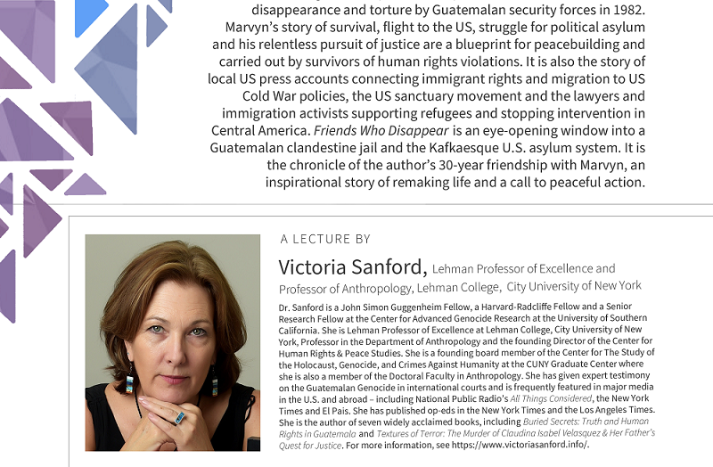 [Speaker] Prof. Victoria Sanford, City University of New York [Date/Time] October 14th, 2025 Tuesday 10:00-11:30 [Venue] Online only [Title] Friends Who Disappear -