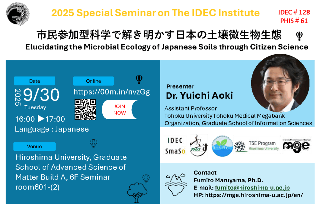 【IDEC Seminar No.128/PHIS Seminar No.61】 市民参加型科学で解き明かす日本の土壌微生物生態 Elucidating the Microbial Ecology of Japanese Soils through Citizen Science